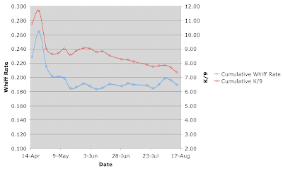 Now we're getting somewhere. Chamberlain has better control against right-handers, as evidenced by the lower walk rate and higher strikezone rate for the fastball. The whiff rate for the fastball is much better to righties. Is that directly caused by the better velocity? And is better velocity due to being in more pitcher's counts? These are questions that are tough to answer, particularly given the small sample sizes. The slider looks like a more effective pitch to lefties for some reason, but he only goes to is 16% of the time - again, this is probably related to worse control. Maybe the pitch's effectiveness against lefties is due to the limited sample? Would being in hitters' counts more make him go to the slider more? That's a lot of questions that I don't really have answers to. That's for Chamberlain and Jorge Posada to figure out.